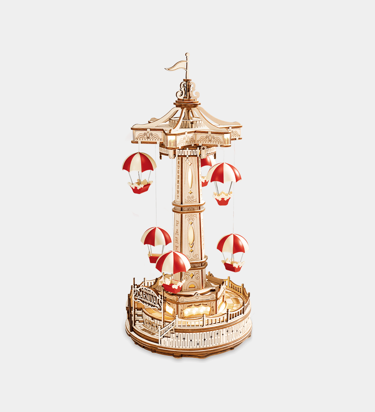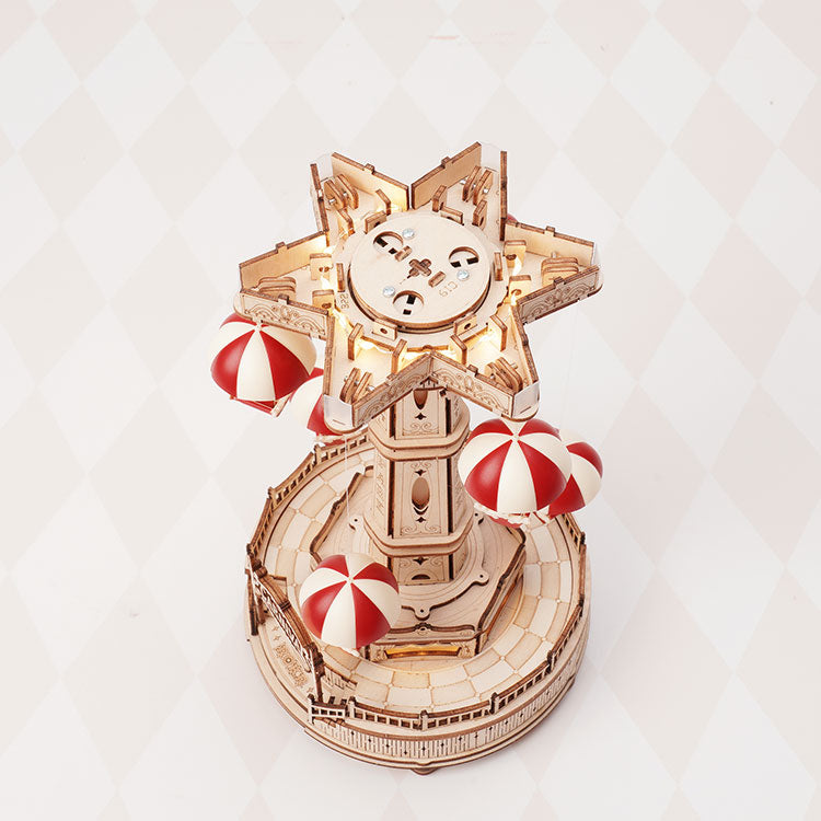 ROKR Parachute Tower EA01 is a DIY music box 3D wooden puzzle kit of the Magic Amusement Park Series. The designer takes the classic parachute tower ride in the real amusement park as the design prototype and modifies it, making the reciprocal lifting parachute staggered ups and downs, which is more creative and fun.